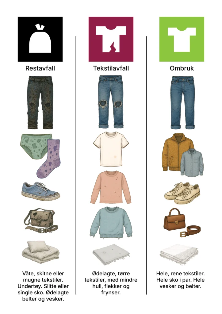 Dersom våte, skitne eller mugne tekstiler leveres sammen med brukbare tekstiler, kan hele leveransen bli ubrukelig. Dette må sorteres og håndteres som avfall.